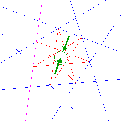 | 15. |   | Draw the connecting line between the angular point, mentioned in step 14, and the fourth angular point from here, both of heptagon 14, counted counterclockwise (which is of course the third one counted clockwise), as shown. |
