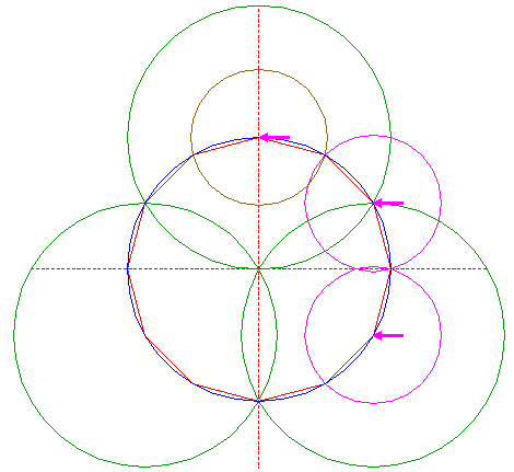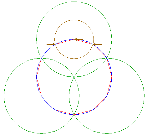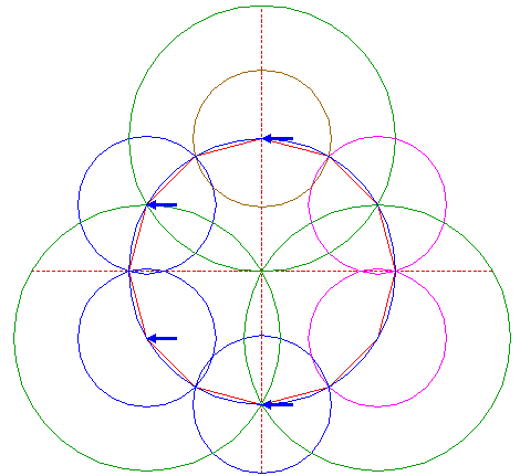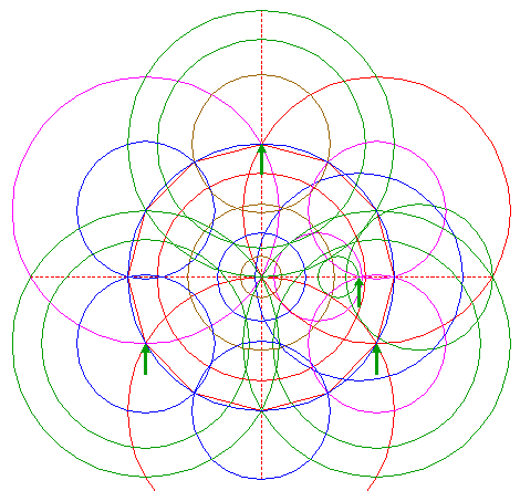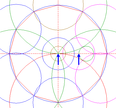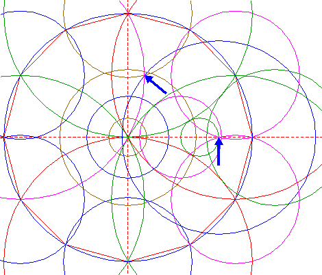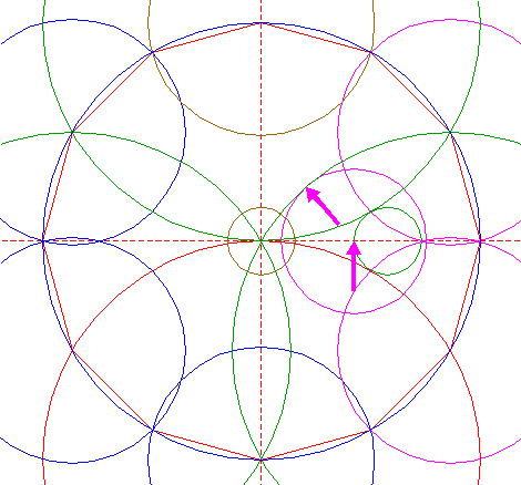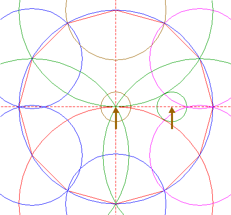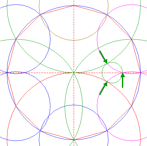 | Copy circle 4 two times, to the righthand angular points of dodecagon 2, just above and below the horizontal centerline. |