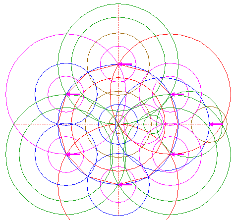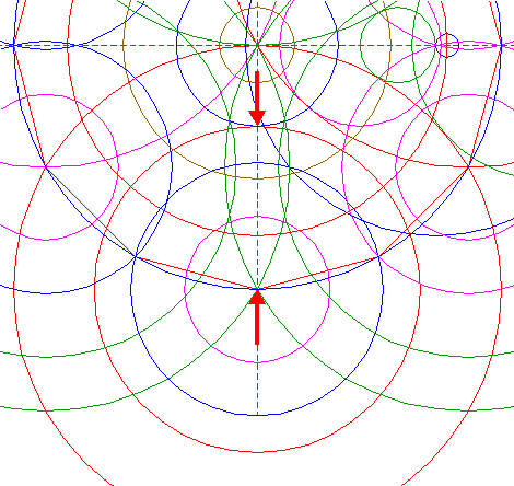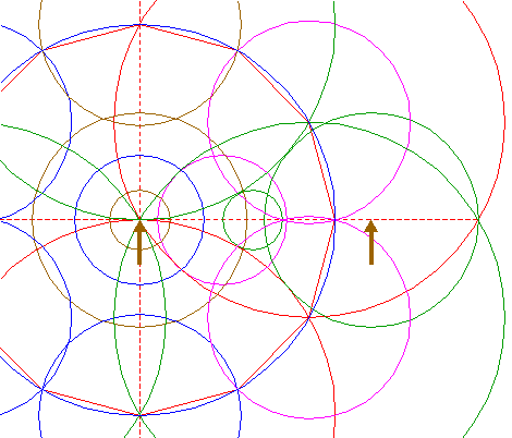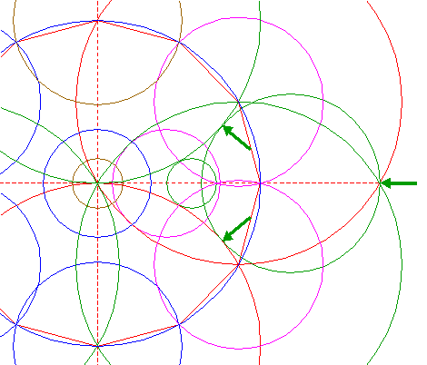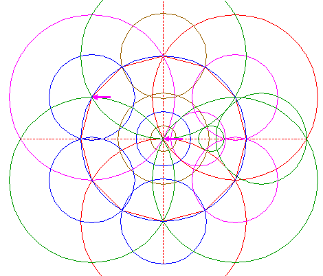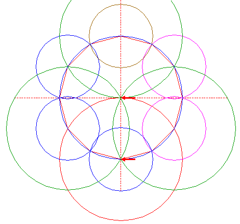 | Construct a circle centered at the lefthand intersection of both circles 5, passing through the lower intersection of circles 4 and 15. |