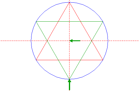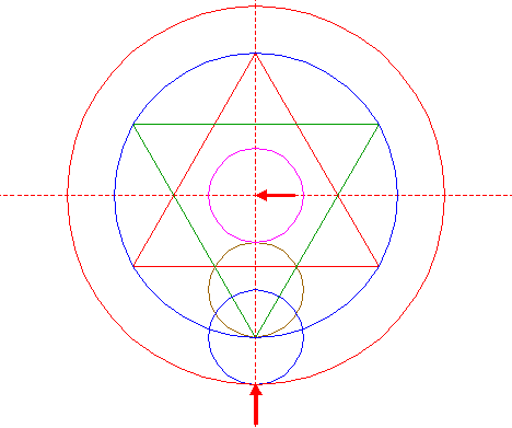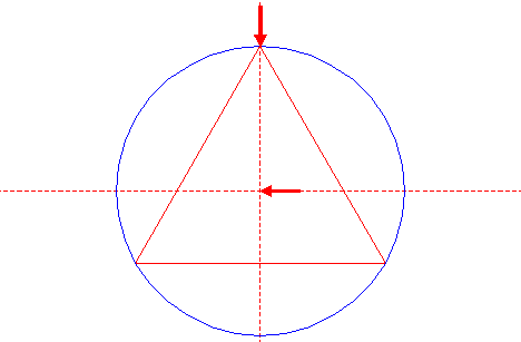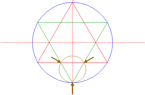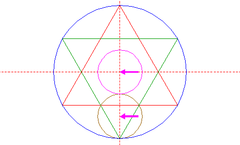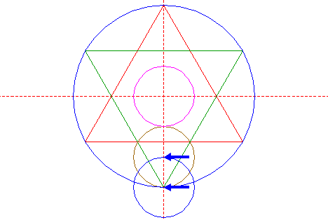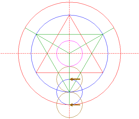 | Construct the inscribed equilateral triangle of circle 1, pointing down. |