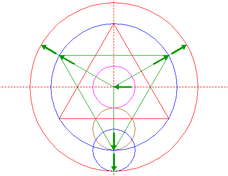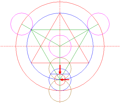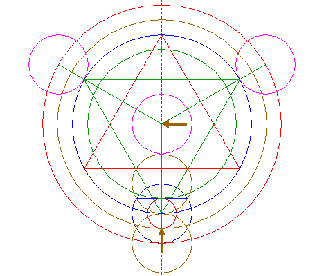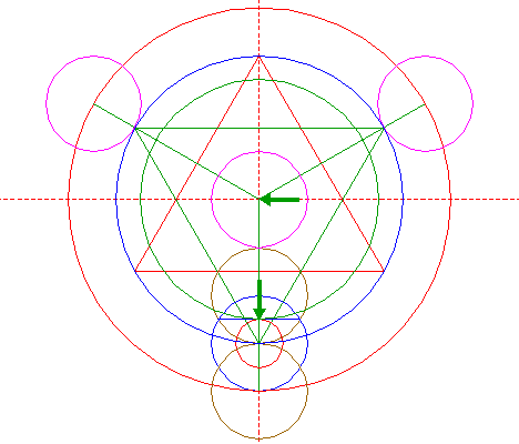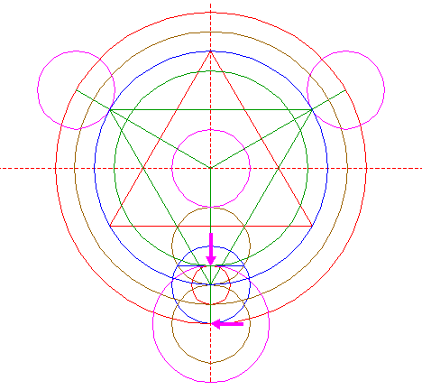 | Draw the three rays of triangle 3, from the center of circle 1, and extend these up to circle 7. |