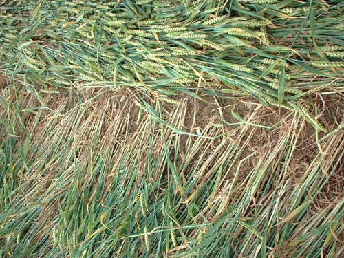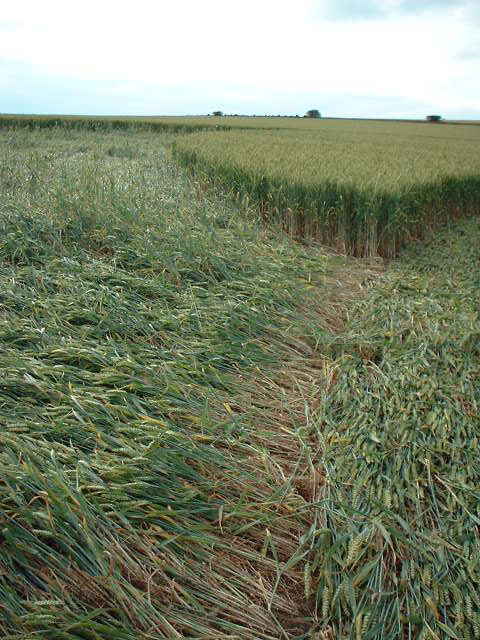 his path. At these spots the crop is very damaged, broken and flat to