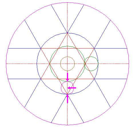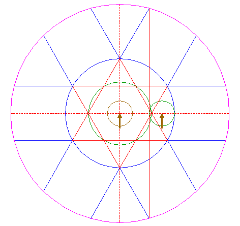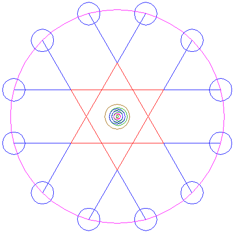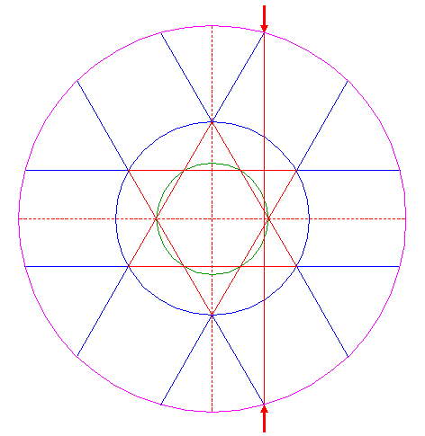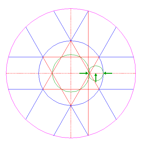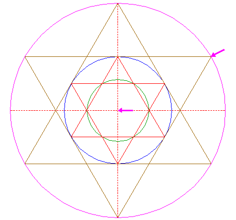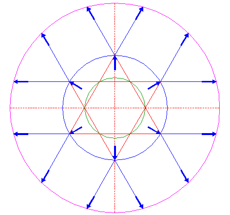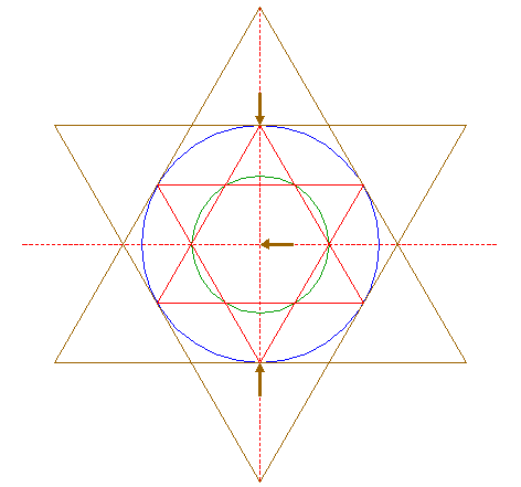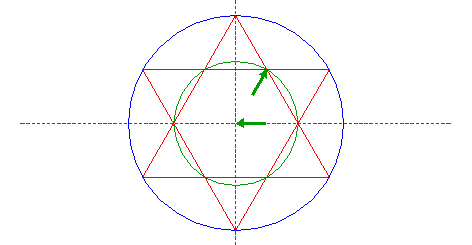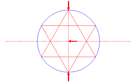 | 4. |   | Create the circumscribed regular six-pointed star of circle 1, by constructing two circumscribed equilateral triangles, one pointing up, one pointing down. |