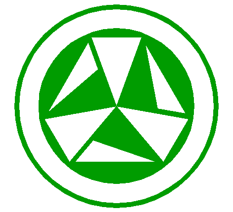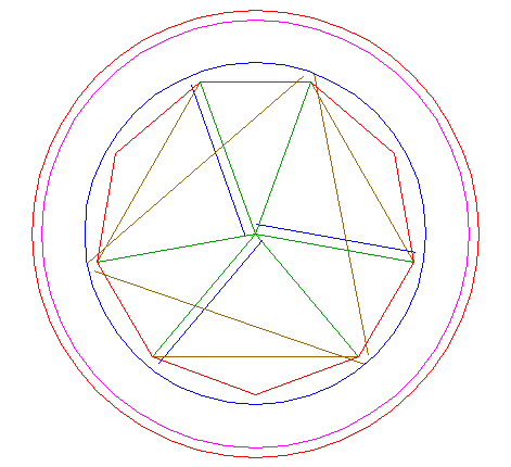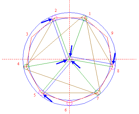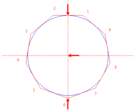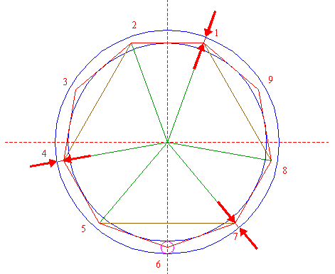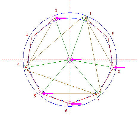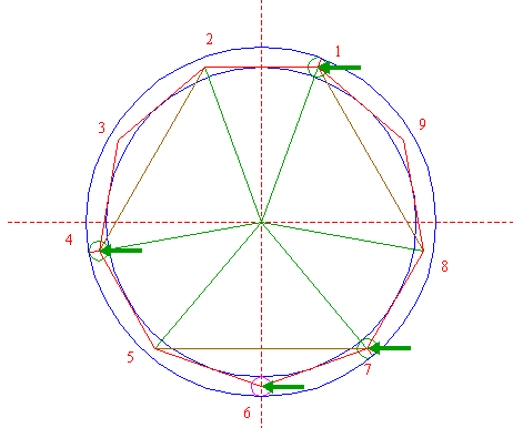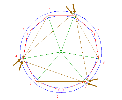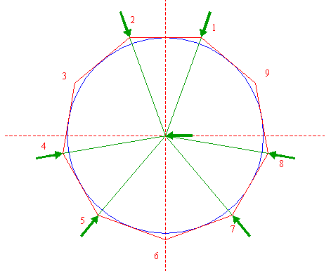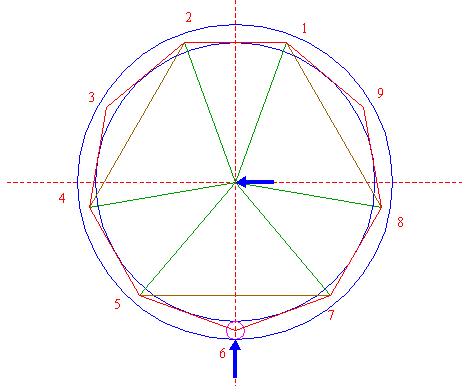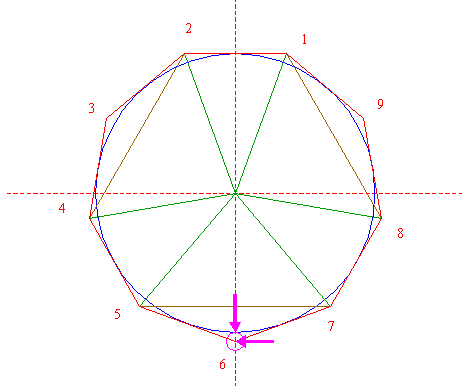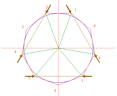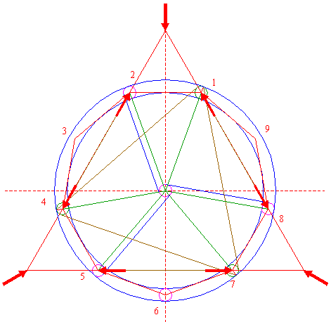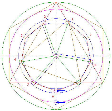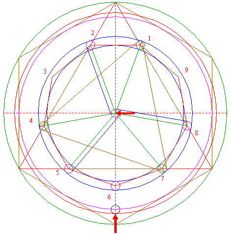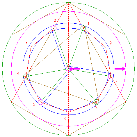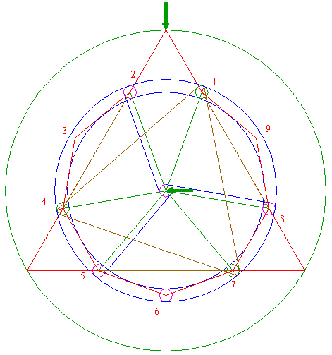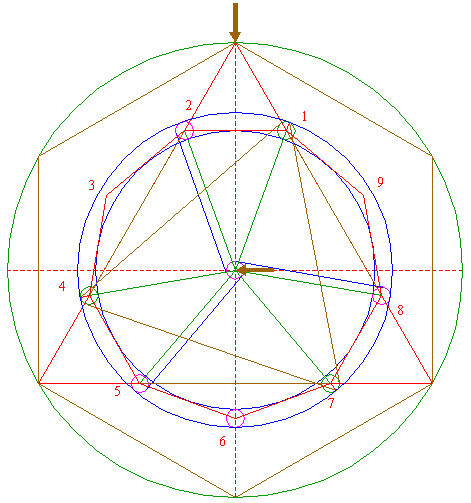 | Construct the circumscribed nonagon (regular 9-sided polygon) of circle 1, pointing down. (Note, that this can not be done by ruler-and-compass construction; the co-ordinates of the angular points have to be calculated). Number the angular points, starting at the upper right hand one, counterclockwise, as shown. |
