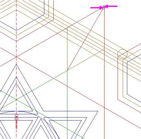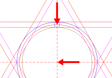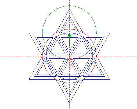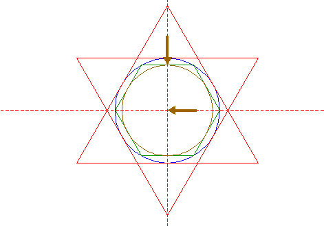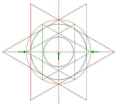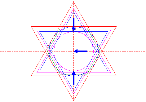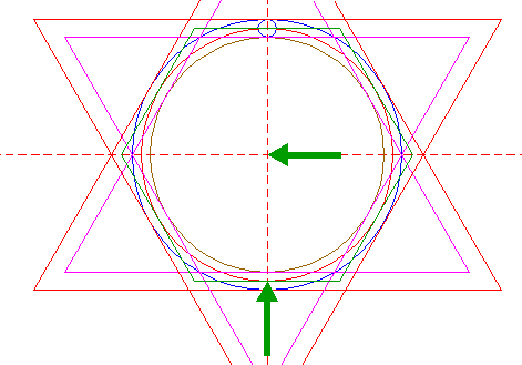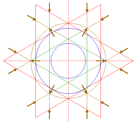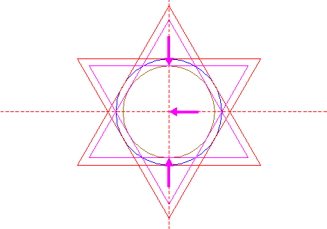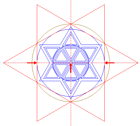 | Construct two circumscribed equilateral triangles of circle 21, one pointing to the left, one to the right. |