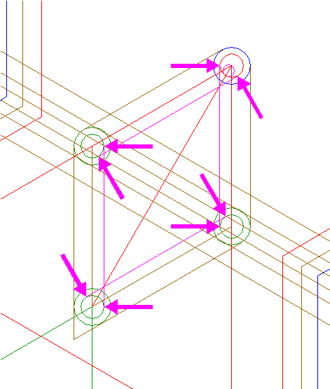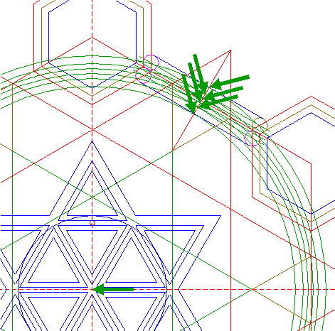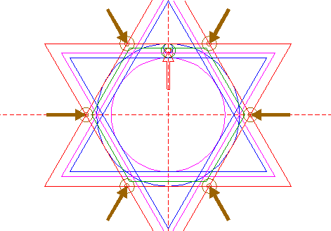 | Copy circles 12 and 13 as one set six times, to the mutual intersections of triangles 2. |