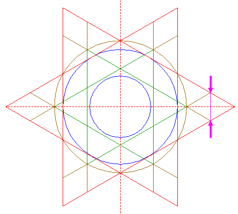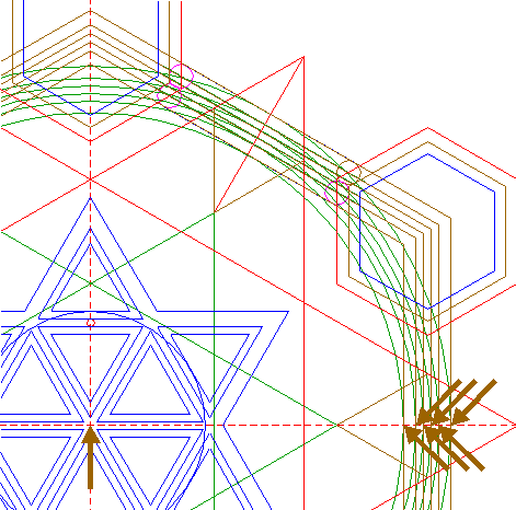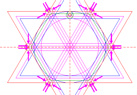 | Draw three sets of four parallel lines, 60° apart, tangent to opposite pairs of circles 14 at both sides, as shown. See also detail. |
