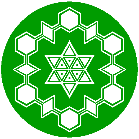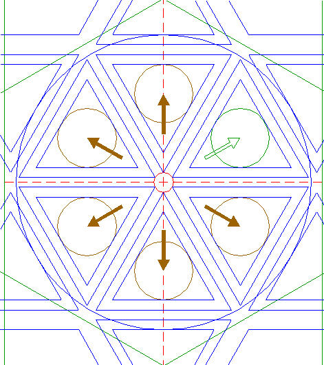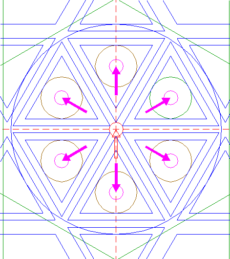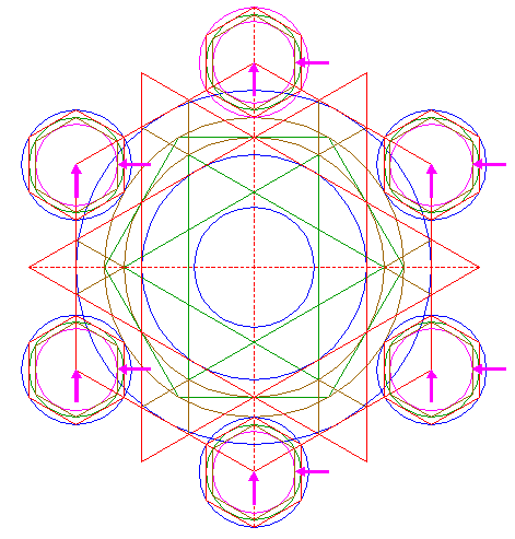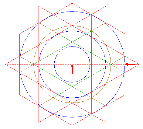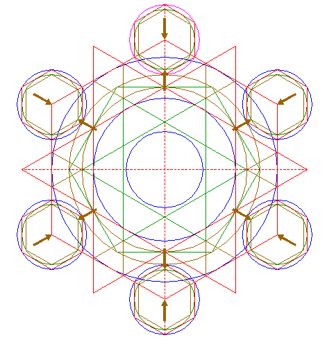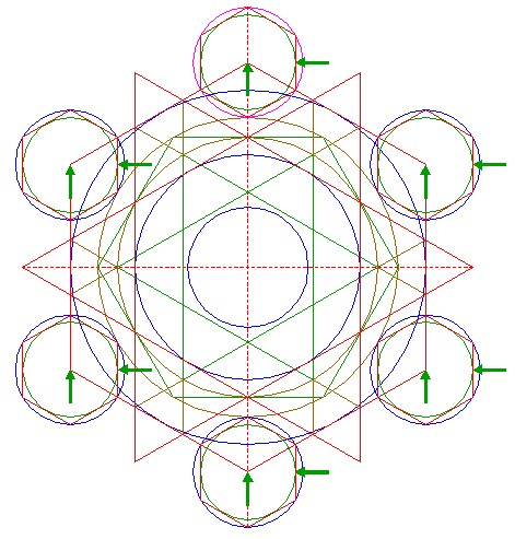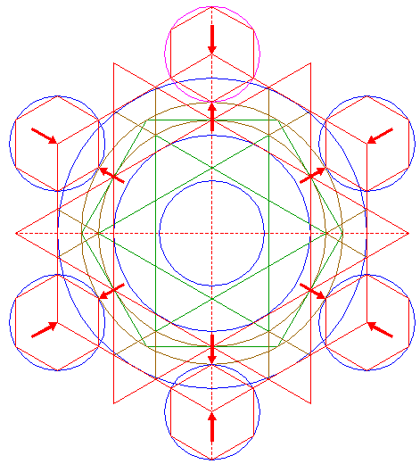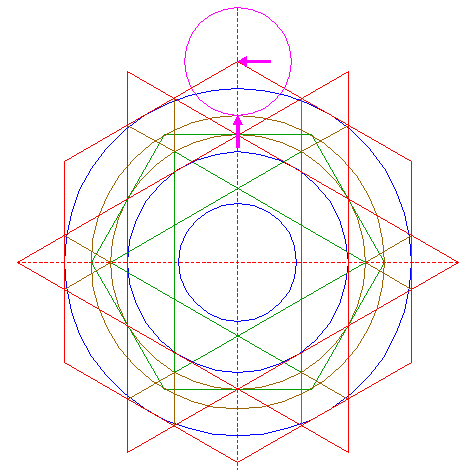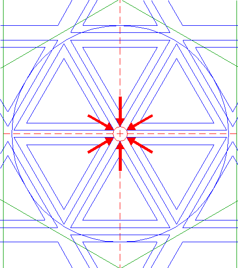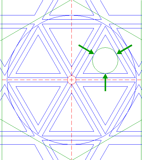 | Construct a circle passing through the angular points of the six most central sets of equilateral triangles of pattern 16, that are closest to the center of circle 1. |