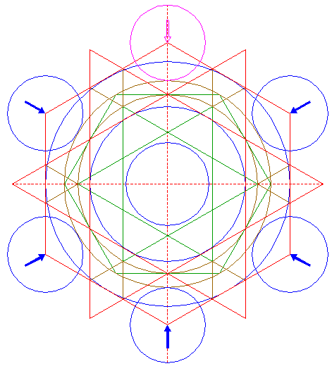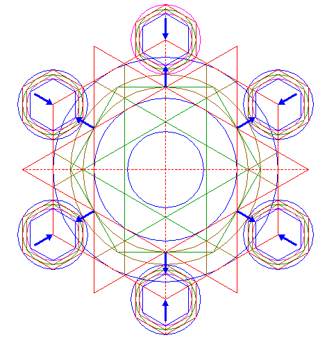 | Construct six inscribed hexagons of circles 30 and 31, each with an angular point pointing towards the center of circle 1. |