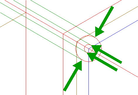 | Construct a circle concentric to circle 1, passing through the righthand intersection of triangles 2. |