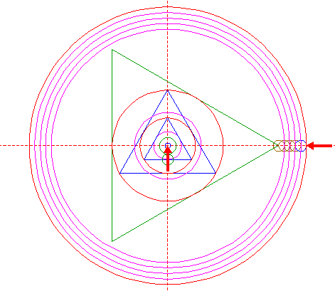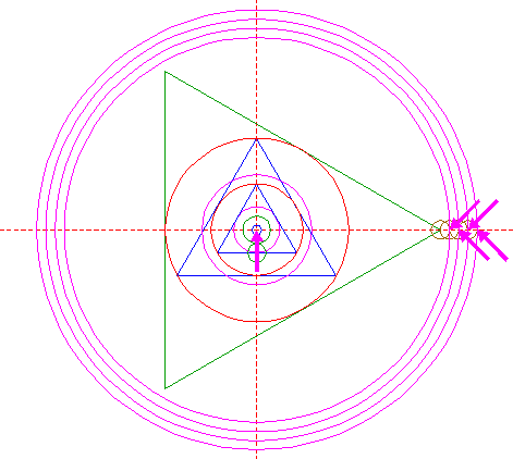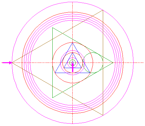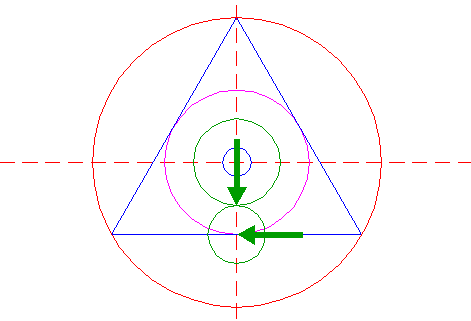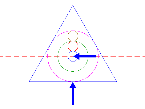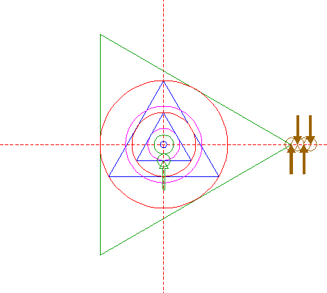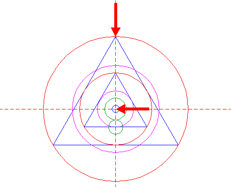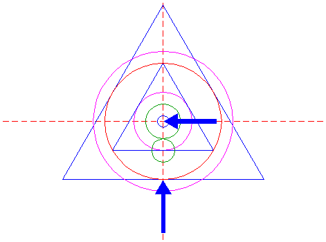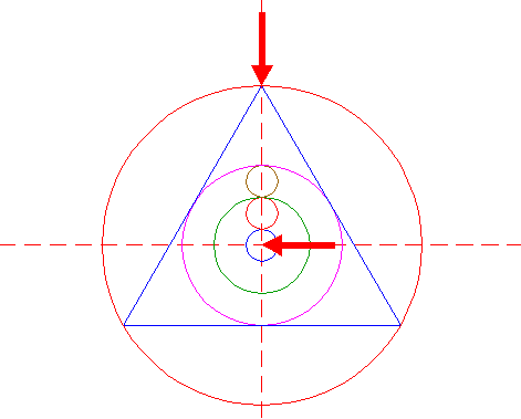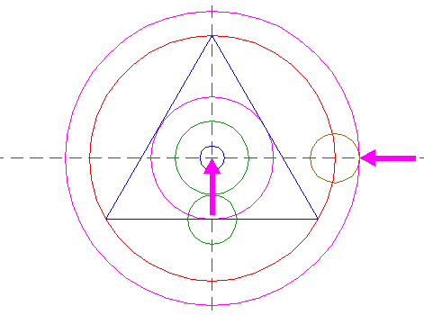 | Copy circle 8 four times, the first to the righthand angular point of triangle 13, the second to the righthand intersection of the first and the horizontal centerline, the next to the corresponding intersection of the second, and so on. |