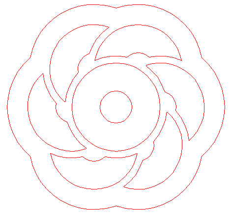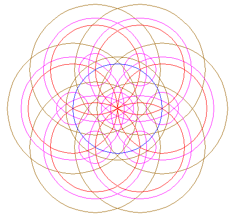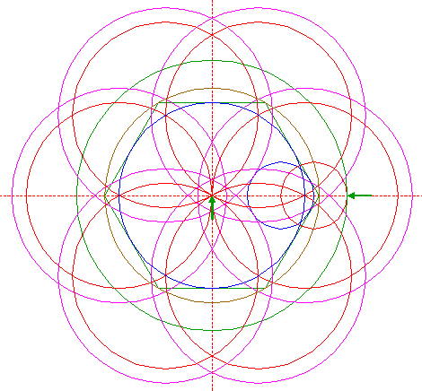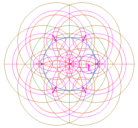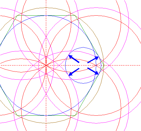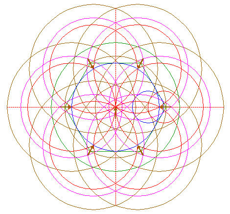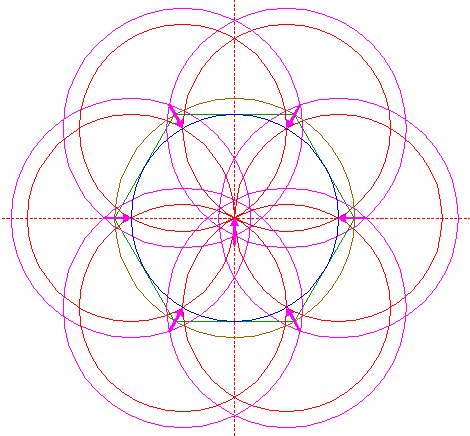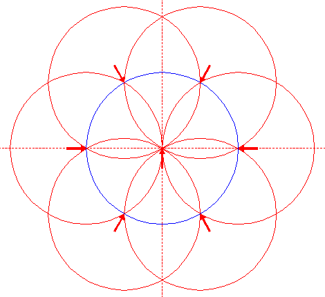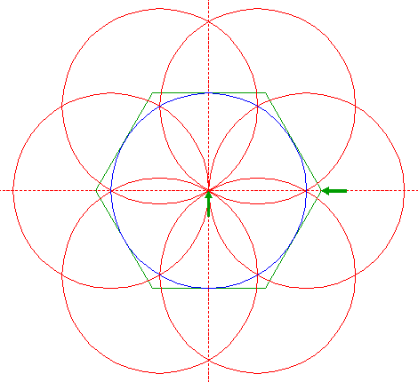 | Create a "flower-of-life"-pattern, by copying circle 1 six times, first to its righthand intersection with the horizontal centerline, then to its consecutive intersections with the copied circles. |