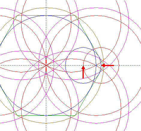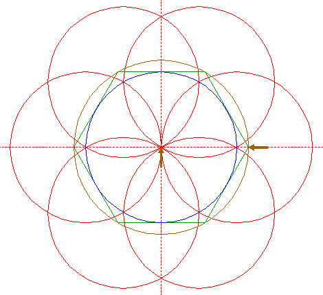 | Construct the circumscribed hexagon (regular 6-sided polygon) of circle 1, pointing to the right. |
