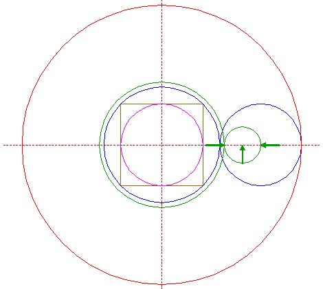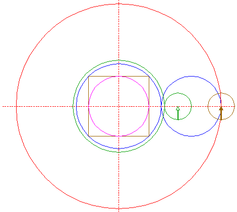 | 27. |   | Construct a square, centered (the center of its inscribed circle) at the center of circle 1, sides horizontally and vertically, and passing through the center of circle 26. |
