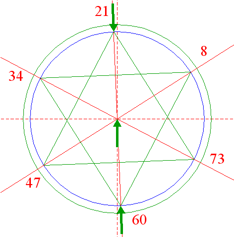 | 13. |   | Construct two inscribed equilateral triangles of circle 1, one pointing at ray 12 nr. 21, the other at nr. 60. |