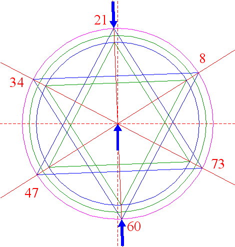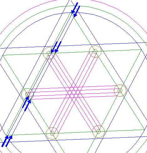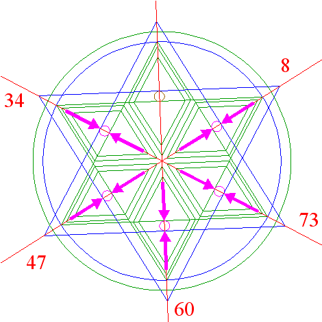 | 25. |   | Repeat step 24 five times, for the other pairs of sides of triangles 13 and 16 and rays 12 nrs. 8, 34, 47, 60 and 73. |