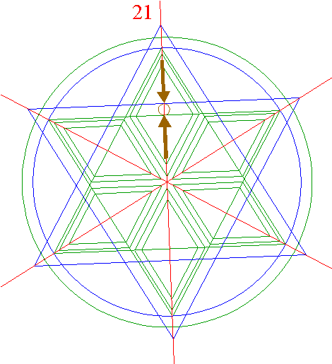 | 17. |   | Construct a (small) circle centered at the lefthand intersection of triangles 13, passing through the intersection of "upper" triangle 13 (the one pointing at ray 12 nr. 21) and ray 12 nr. 40. |