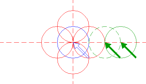 | Copy circle 1 to the righthand intersection of righthand circle 2 and the horizontal centerline. Move this circle (copy and delete original) to its own righthand intersection.
