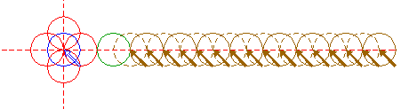 | Repeat step 3 eight more times, to create (together with righthand circle 2 and circle 3) ten tangent circles on a row, as shown.