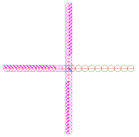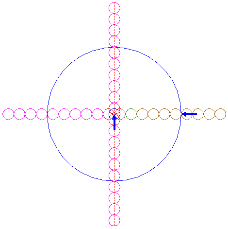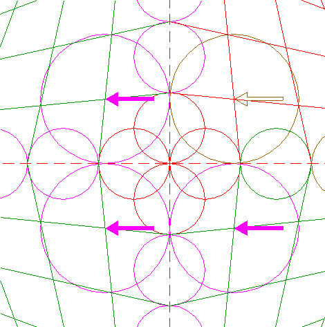 | Repeat steps 3 and 4 relative to the other three circles 2, and in the other three directions, horizontally and vertically. This will yield twenty tangent circles on a row, horizontally as well as vertically, as shown.