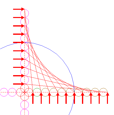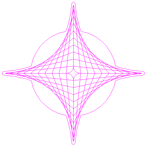 | Draw ten lines, the first from the upper intersection of the first of circles 2 and 5 vertically (up) and the vertical centerline to the righthand intersection of the last circles 2 and 4 (horizontally) and the horizontal centerline, the second from the corresponding intersections of the second of circles 2 and 5 to the second last circles 2 and 4, and so on, as shown.