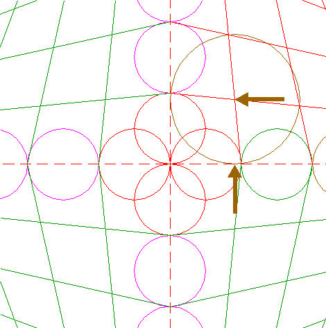 | Construct a circle centered on the horizontal centerline, passing through the center of the rightmost circle 4, and through its righthand intersection with the horizontal centerline.