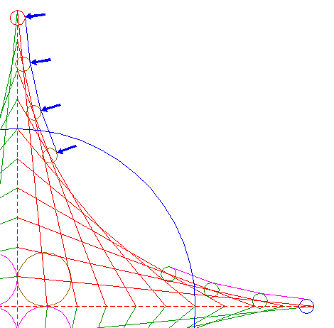 | Draw three lines, tangent to circle 11 and successive circles 13, all at the upper sides, as shown.