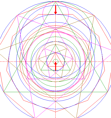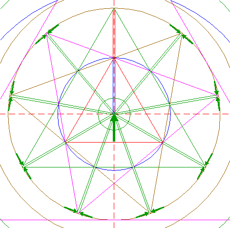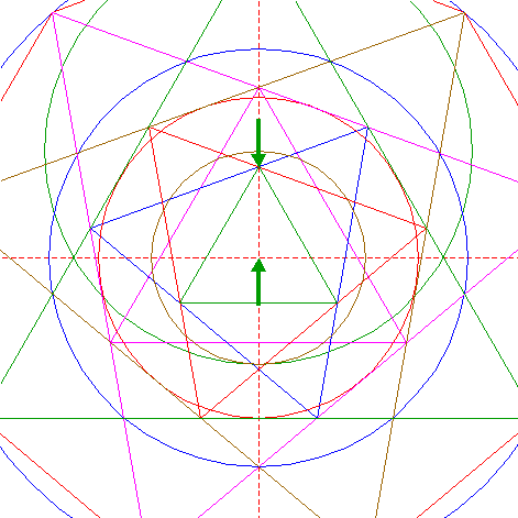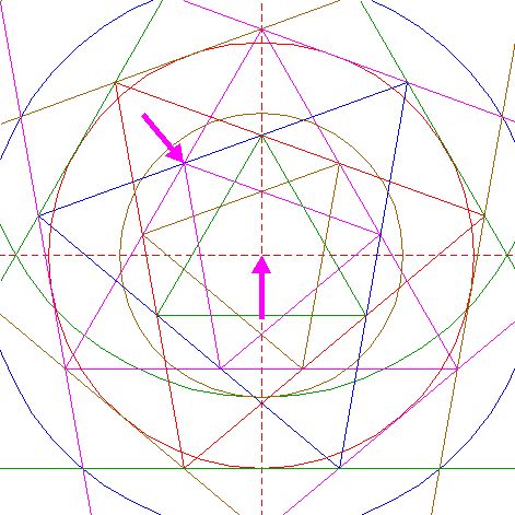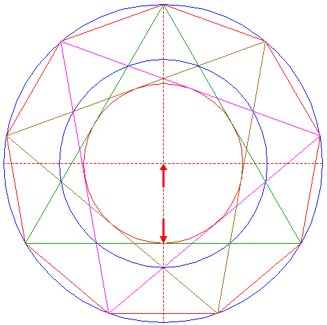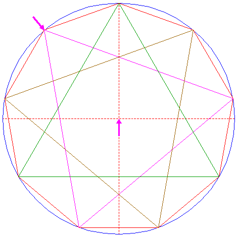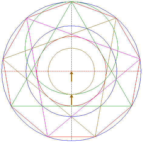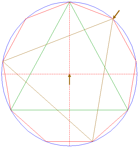 | Construct the inscribed equilateral triangle of circle 1, with the top coincident with the angular point of nonagon 2 next to the top, to the right. |