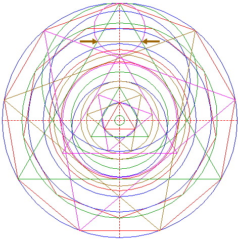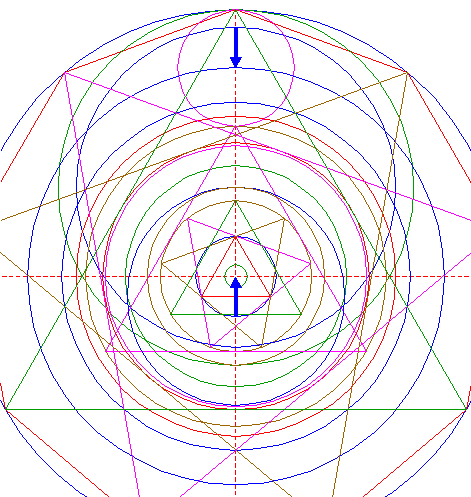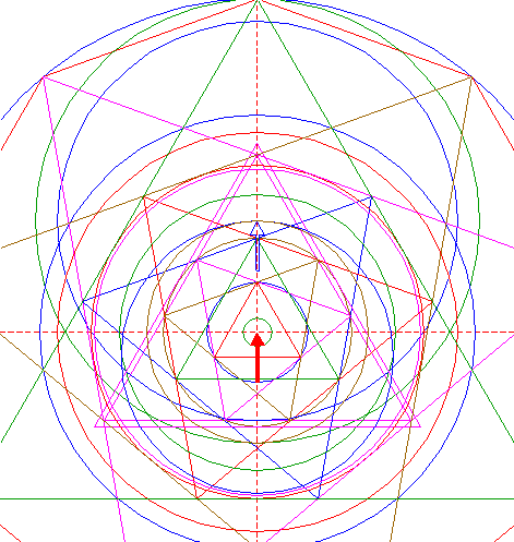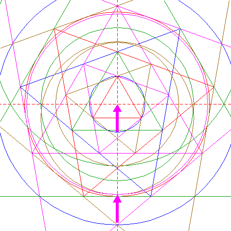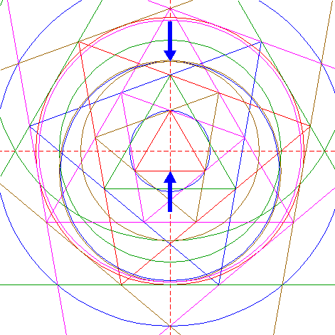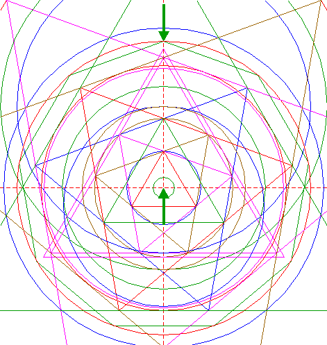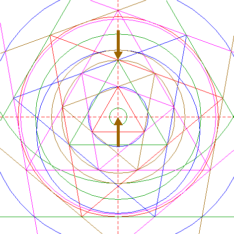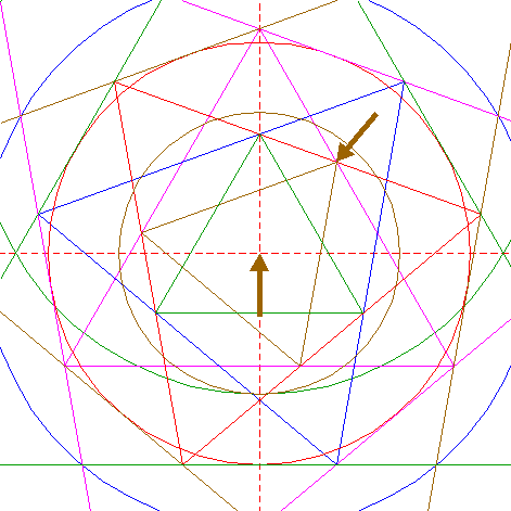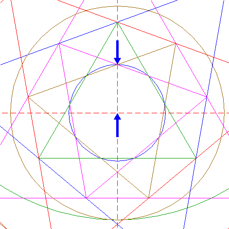 | Construct a circle concentric to circle 1, passing through the inner set of mutual intersections of triangles 13, 14 and 15. |