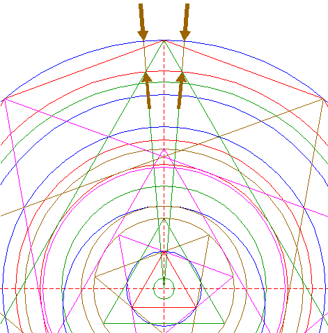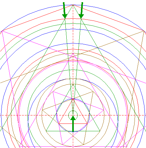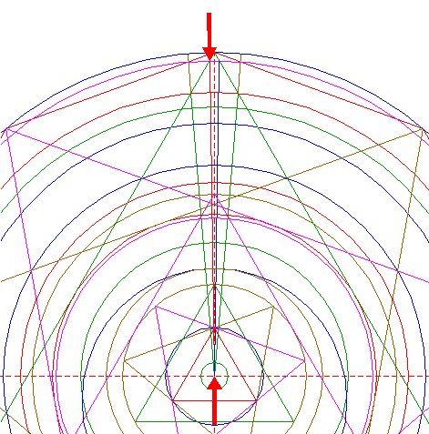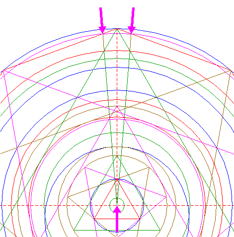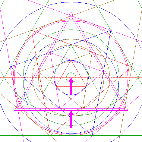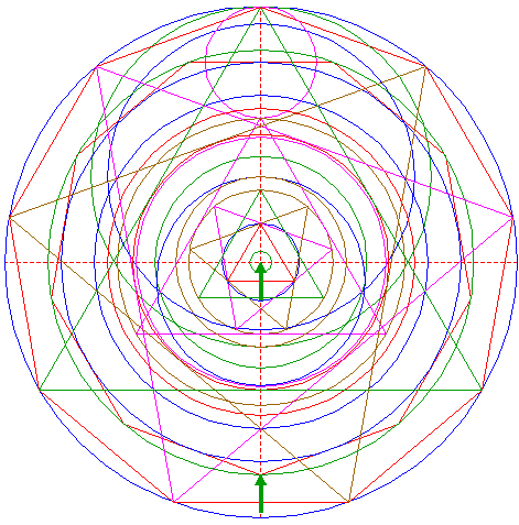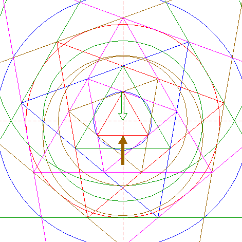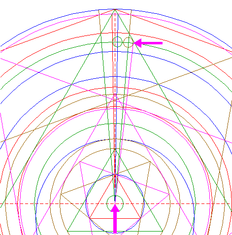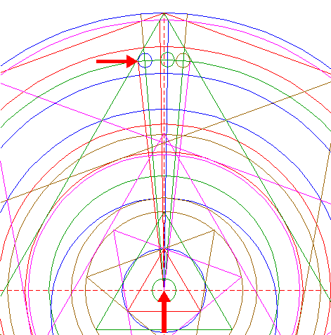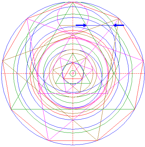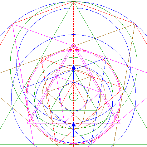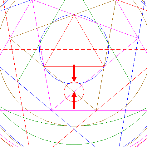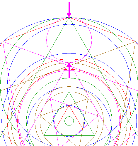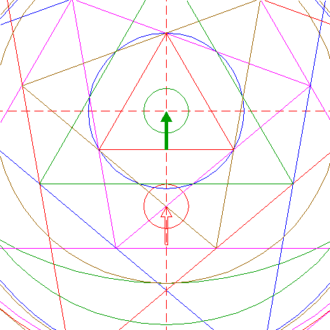 | Construct a circle, passing through the upper intersection of circle 1 and the vertical centerline, and both intersections of triangle 3 and the horizontal centerline. (Notice, that this circle is, when mirrored with respect to the horizontal centerline, half of a Vesica Pisces). |