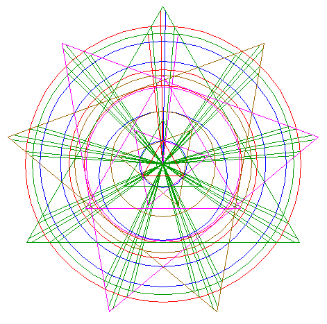 | Construct the inscribed equilateral triangle of circle 1, with the top coincident with the angular point of nonagon 2 next to the top, to the left. (Triangles 3, 4 and 5 make up one inscribed nonagram - nine-pointed star - of circle 1). |