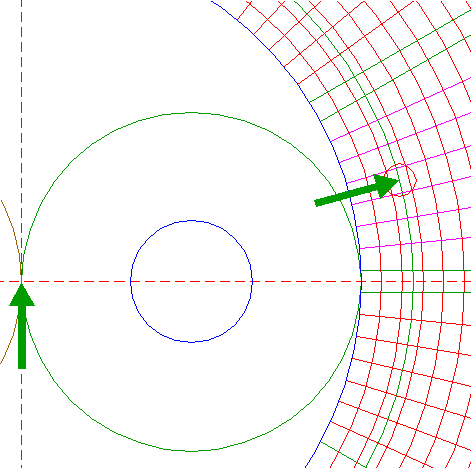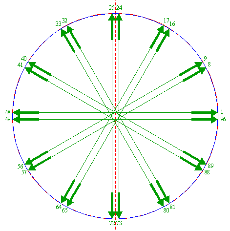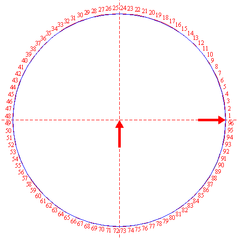 | Construct the circumscribed regular 96-sided polygon of circle 1, with the midpoint of a side on the horizontal centerline. Number the angular points counterclockwise 1 through 96, starting at the rightmost point just above the horizontal centerline, as shown. |