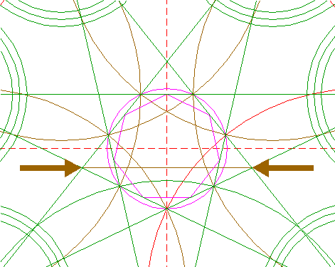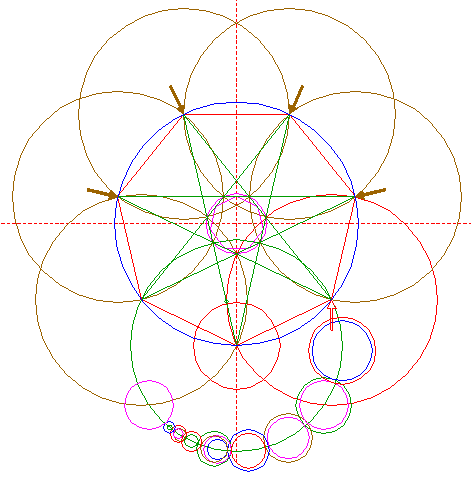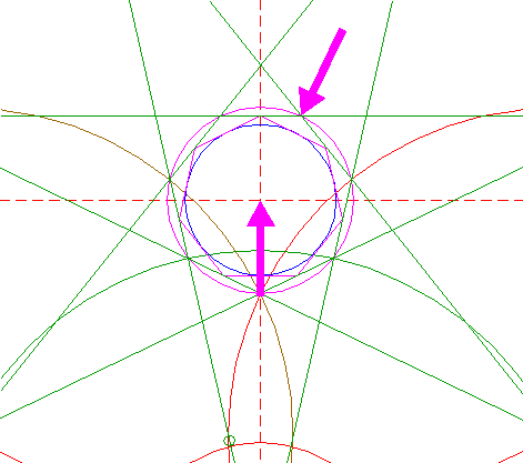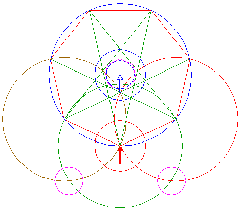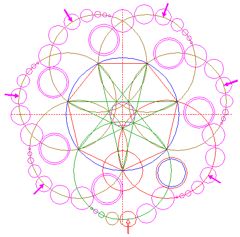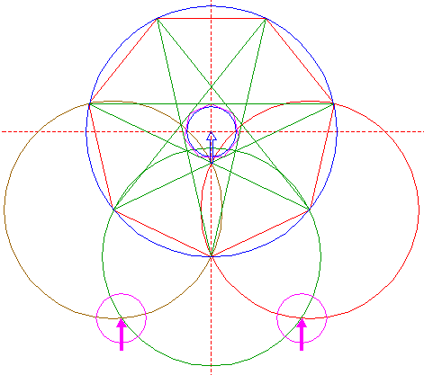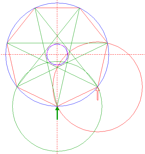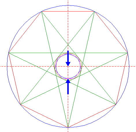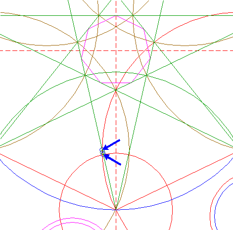 13. | ![]() | Construct a "two-points" circle, defined by the end-points of a centerline (diameter), between the (upper) intersections of the lefthand side of the lower star-point of heptagram 3 with circles 7 and 12, as shown. |