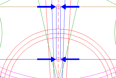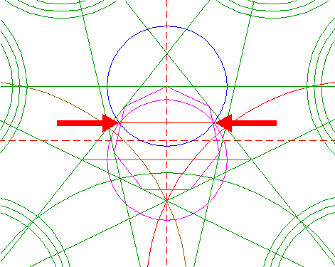 68. | ![]() | Construct two circles, both centered at the intersection of outer circle 37 and righthand line 66, tangent to righthand circle 67 at both sides. |