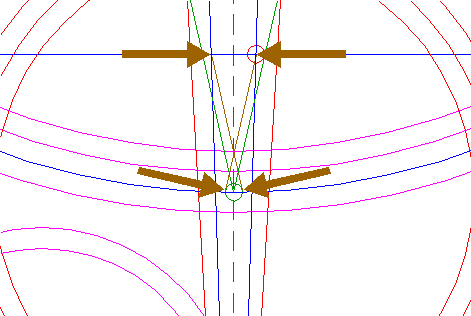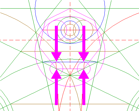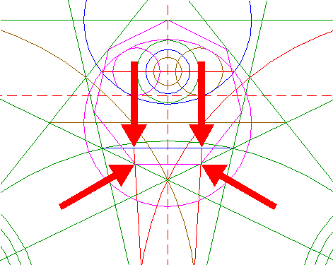 60. | ![]() | Construct three circles, all concentric to circle 1, passing through the upper and lower intersections of circles 58 and the upper intersection of circle 59 with the vertical centerline. See detail. |
