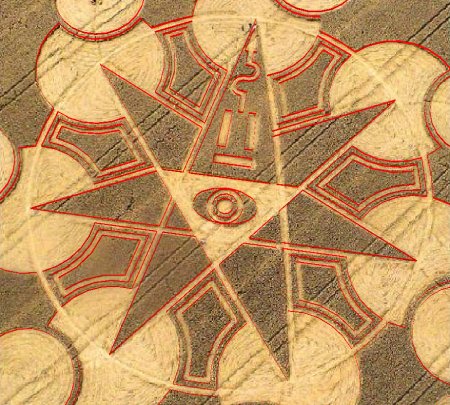 54. | ![]() | Draw the connecting line between the intersections of the lower sides of the lower lefthand and righthand star-points of heptagram 3 and the outer circles of both lower sets of circles 38, as shown. |