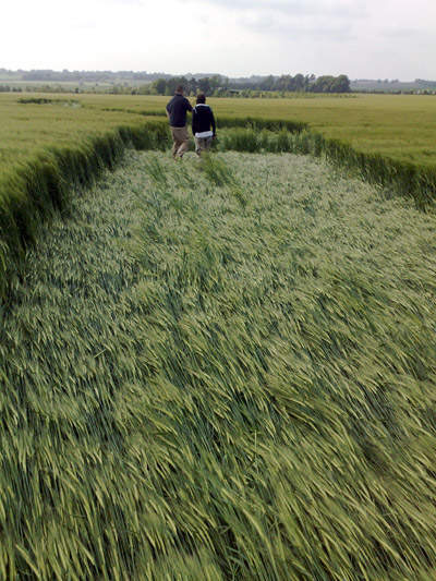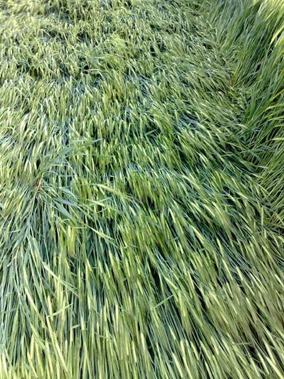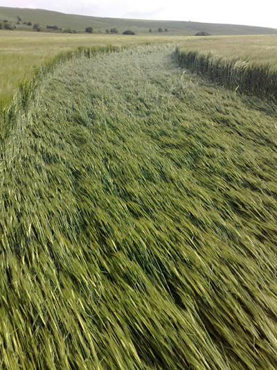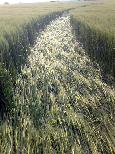 across approximately 620 feet of young barley crop. The laid crop