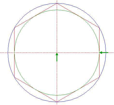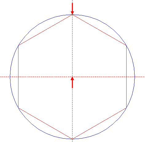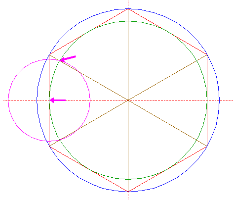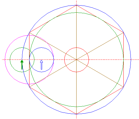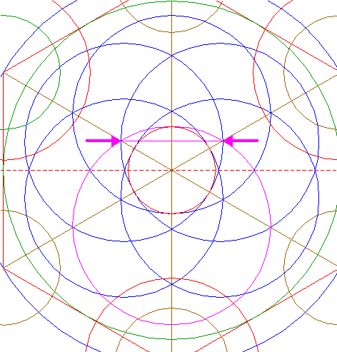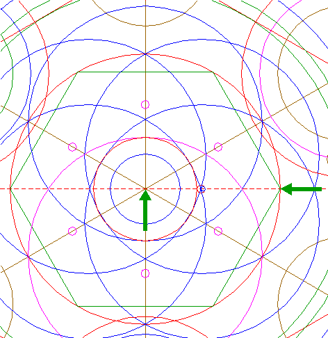 | Construct a circle centered at the righthand intersection of circle 8 and the horizontal centerline, passing through the upper (and lower) lefthand angular point of hexagon 2. |