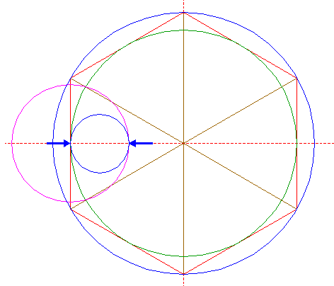 | Construct a circle centered at the intersection of the righthand side of hexagon 2 and the horizontal centerline, tangent to the upper righthand circle 12 at the lower side. |