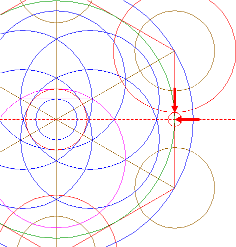 | Construct a circle centered at the righthand intersection of the upper and lower lefthand circles 11, tangent to circle 7 at the righthand side. |