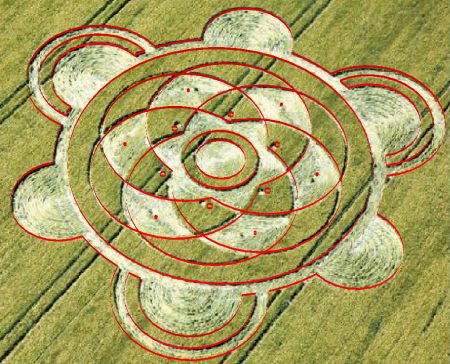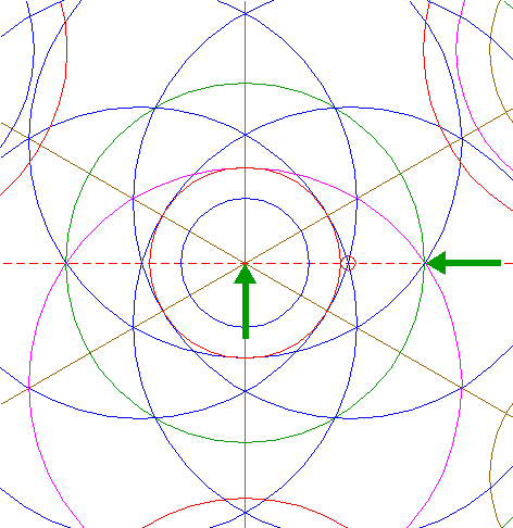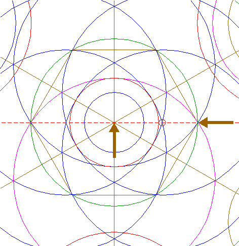| Construct a circle concentric to circle 1, passing through the upper intersection of the upper lefthand and righthand circles 11. |