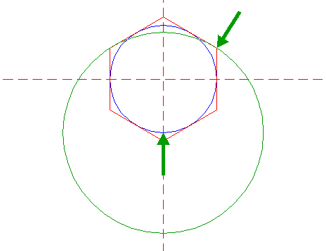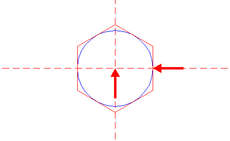 | Construct a circle centered at the lower intersection of circle 1 and the vertical centerline, passing through the upper righthand (and lefthand) angular point of hexagon 2. |