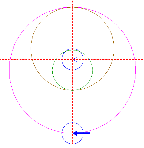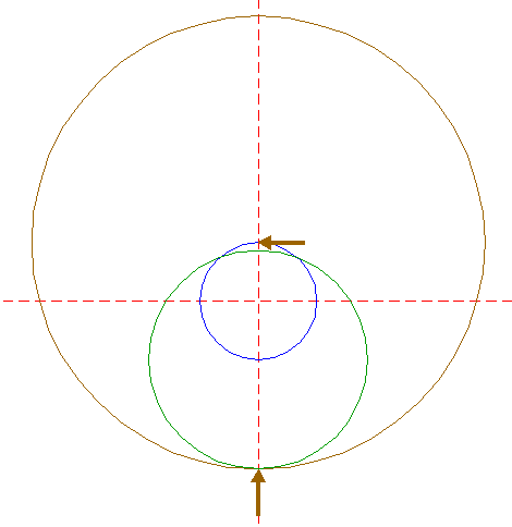 | Construct a circle centered at the lefthand intersection of circle 1 and the horizontal centerline, tangent to circle 1 at the righthand side. |
