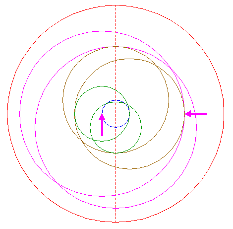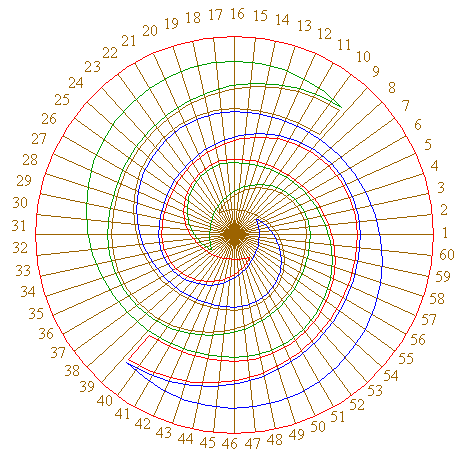 | Create 60 evenly spaced rays of circle 7, the first from the center to the righthand intersection with the horizontal centerline; number the rays counterclockwise, starting from nr.1, as shown. |
