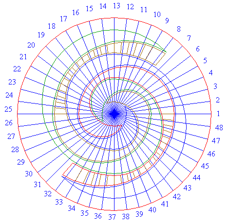 | Create 48 evenly spaced rays of circle 7, the first from the center to the righthand intersection with the horizontal centerline; number the rays counterclockwise, starting from nr.1, as shown. |