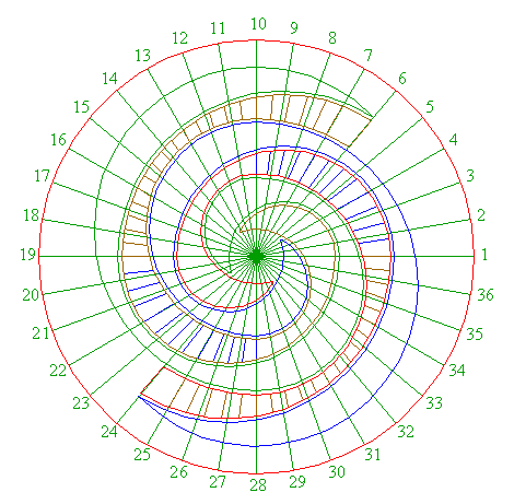| Remove from rays 23 nrs. 2 to 10, and nrs. 20 to 28. Remove from nrs. 11 to 19 both ends outside the borderlines of the upper lefthand part (second quadrant) of spiral 16. Remove from nrs. 29 to 1 both ends outside the borderlines of the lower righthand part (fourth quadrant) of spiral 18. As shown. |