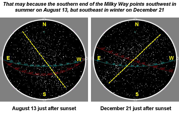 points southwest in summer on August 13, but southeast in winter on