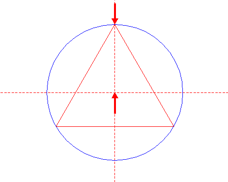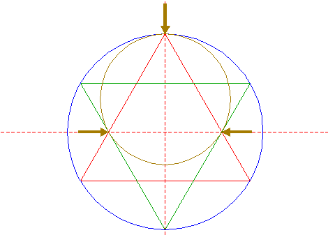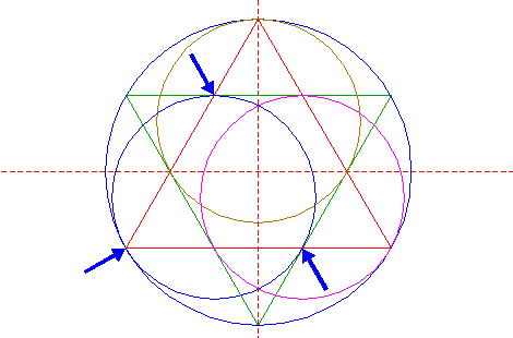 | Construct a circle, passing through the top of triangle 2, and passing through the lefthand and righthand intersections of triangles 2 and 3. |