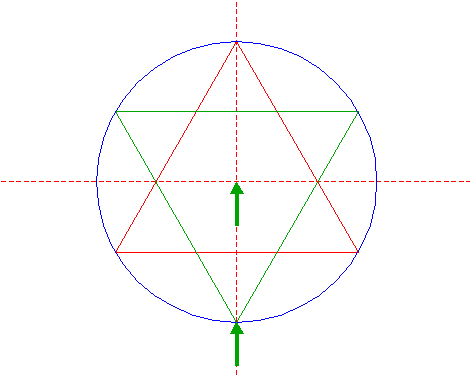 | Construct the inscribed equilateral triangle of circle 1, pointing up. |