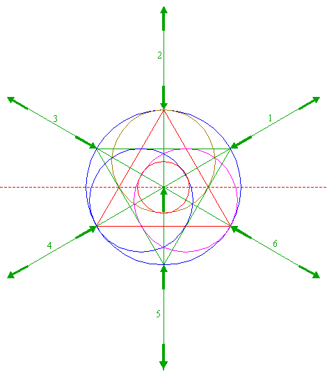 | Draw six rays, from the center of circle 1 to the angular points of triangles 2 and 3, and extend these rays, as shown. Number the rays counterclockwise 1 through 6, starting with the upper righthand one. |